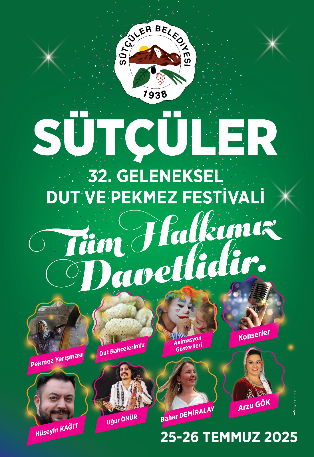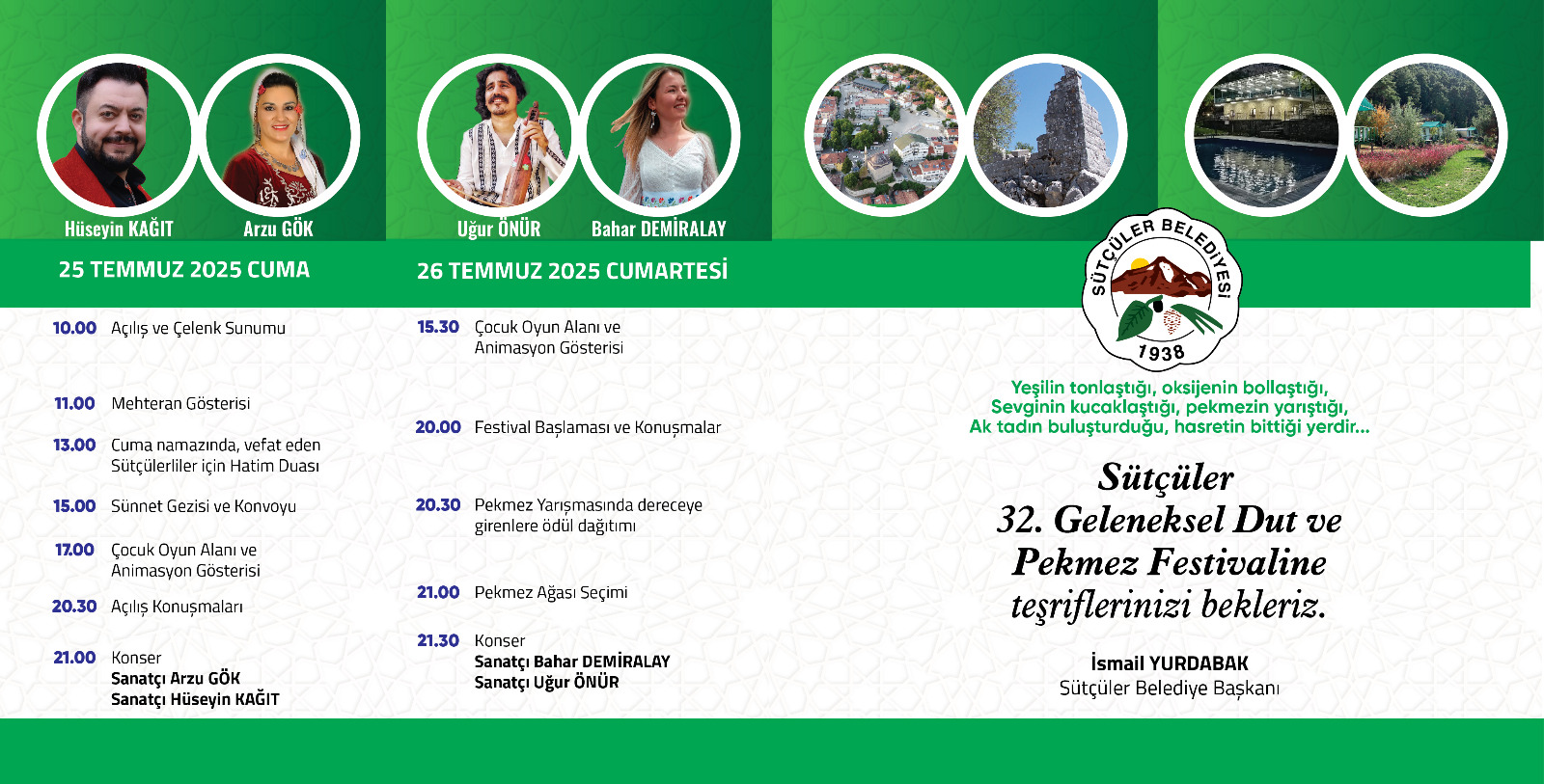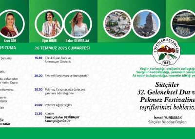 Hamdolsun, bu yıl 32’ncisini düzenleyeceğimiz Geleneksel Sütçüler Dut ve Pekmez Festivalimize bir kez daha sizleri gönülden davet etmenin heyecanı ve mutluluğu içerisindeyim. Rabbim birliğimizi, beraberliğimizi daim eylesin. Bu toprakların alın teriyle, emeğiyle, duasıyla yoğrulmuş dutu ve pekmezi bizim için sadece bir ürün değil; bir kültür, bir miras, bir berekettir. İşte bu yüzden festivalimiz, sadece bir etkinlik değil; Sütçüler’in kardeşlik sofrasıdır, samimiyetidir, bir araya gelme vesilesidir.